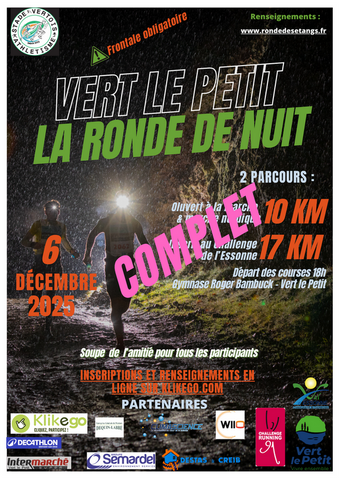 Retrait des dossards le samedi 6 Décembre de 14 h à 17 h et au plus tard 15' avant l'épreuve Gymnase Roger Bambuck à Vert le Petit.Pas d'inscriptions sur place